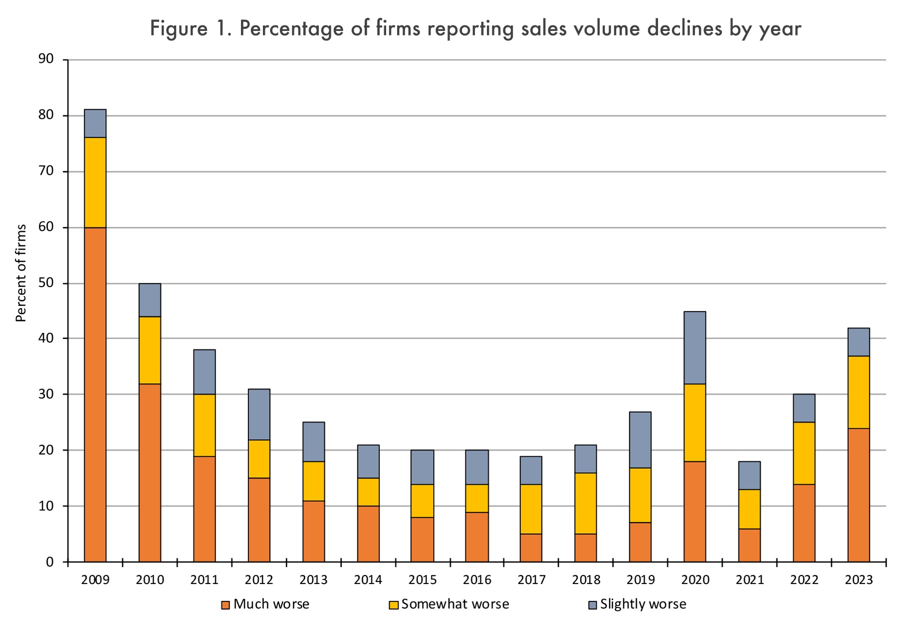 Анализ показателей продаж по сравнению с прошлым годом участниками исследования показывает относительно стабильную ситуацию до 2020 года, когда количество фирм, сообщающих о снижении объема продаж, резко возросло (45% сообщили, что объем продаж был «намного хуже», «несколько хуже» или «немного хуже») в связи с пандемией COVID-19 (Рисунок 1). В 2021 году последствия пандемии, по-видимому, смягчились, и только 18% фирм сообщили о снижении объема продаж, что в процентном отношении аналогично уровню до пандемии. Однако, начиная с 2022 года, наблюдался заметный рост числа фирм, сообщающих о снижении объема продаж (30%), который продолжился в 2023 году, когда 42% сообщили о снижении объема продаж. Наибольший рост был отмечен среди фирм, сообщающих о том, что продажи были «намного хуже», и этот показатель увеличился с 14% в 2022 году до 24% в 2023 году.