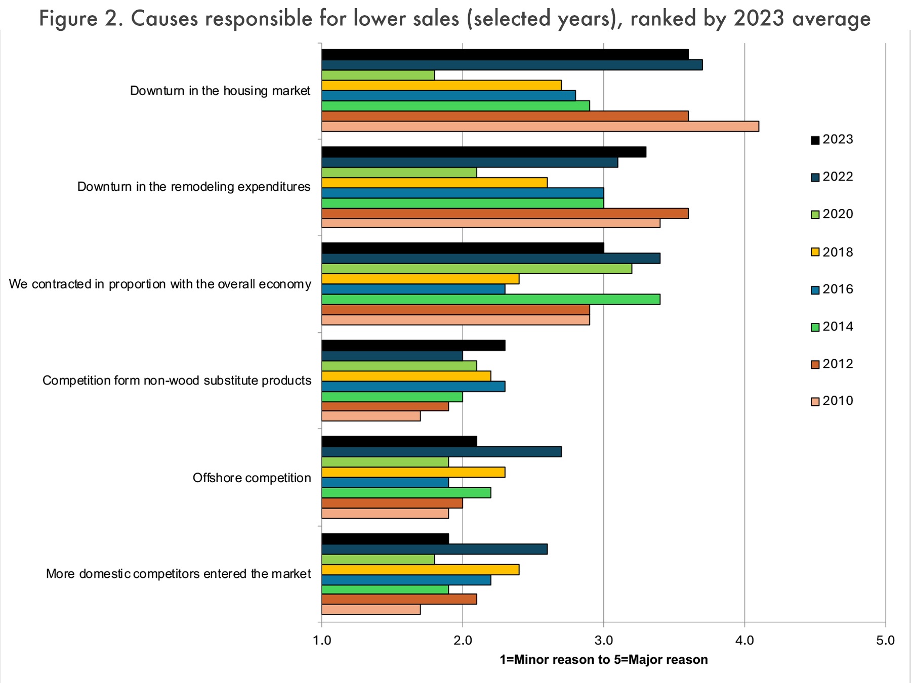 На вопрос о том, с чем связана большая часть (61%-100%) объема их производства, 37% респондентов назвали строительство односемейных домов, за которыми следуют реконструкция (30%), нежилые дома (10%) и многосемейные дома (7%). Это подчеркивает относительную важность строительства односемейных домов, ремонта и реконструкции для вторичной деревообрабатывающей промышленности. И, как показано на рисунке 4 , только 7% и 6% респондентов не вели бизнес на рынках односемейных домов и ремонта и реконструкции соответственно в 2023 году. Это, вероятно, частично объясняет снижение объема продаж для многих фирм в 2023 году, учитывая слабость на этих рынках.