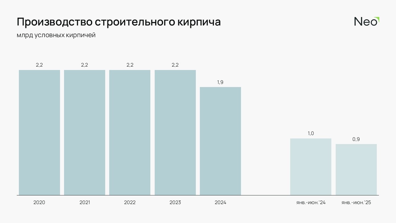 Производство строительного кирпича стагнировало и снизилось в 2024 году на 12,1% по сравнению с 2023-м. Тренд продолжается и в 2025 году: за I полугодие было произведено на 10,5% меньше, чем за аналогичный период 2024-го.