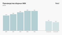 С 2020 по 2024 год на фоне стремительного роста объемов жилищного и нежилищного строительства, простимулированных льготной ипотекой и реализацией масштабных инфраструктурных проектов, среднегодовой темп роста товарного бетона составил 18,5%, сборных ЖБК — 6,8%, кирпича — -3%, к 2024 году производство достигло 69,7 млн м3, 28,4 млн м3 и 1,9 млрд усл. кир. соответственно.