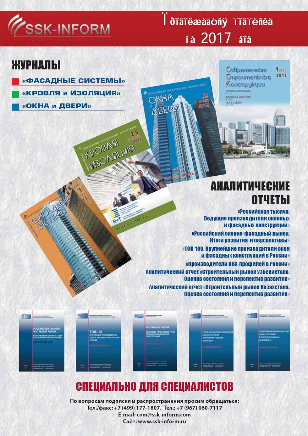 Отчет подготовлен компаниями ИЦ «Современные Строительные Конструкции» и «Агентство ССКИнформ» по результатам работ, выполненных в 2008–2017 гг. в рамках реализации совместного проекта «Мониторинг российского строительного рынка». |